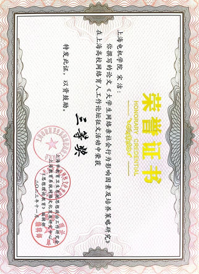 近日,伟德国际1946bv官网宋洁老师在上海高校网络育人工作论坛征文中,以题为《大学生网络亲社会行为影响因素及培养策略研究》一文,喜获三等奖!