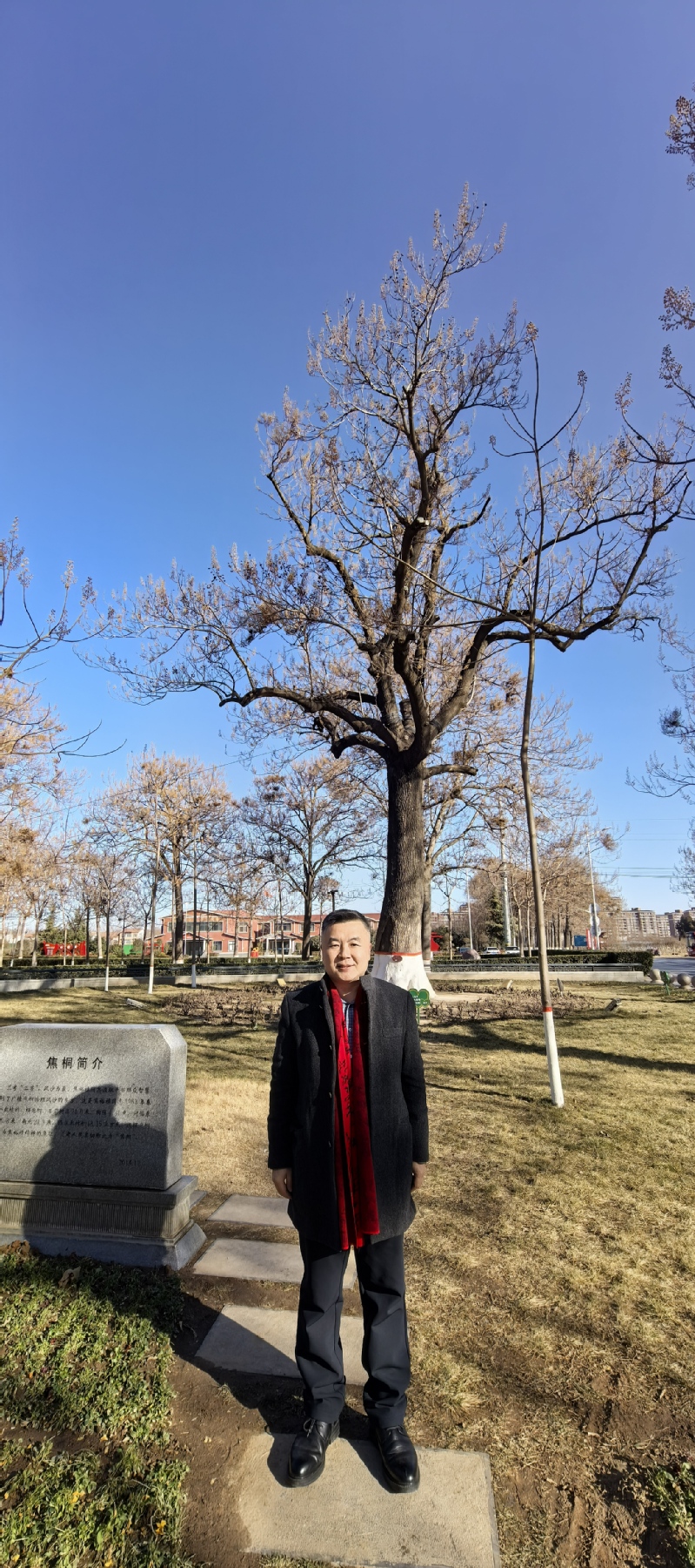 (刘炳辉在焦裕禄书记亲手栽种的泡桐树前留念,这棵“焦桐”自1963年栽种于此,已历62年,远超一般泡桐只有二三十年树龄的情况。现场还有幸遇到了守护这棵树60年的魏善民大爷,当年正是20岁的小伙子魏善民与焦裕禄一起栽下这棵泡桐。)